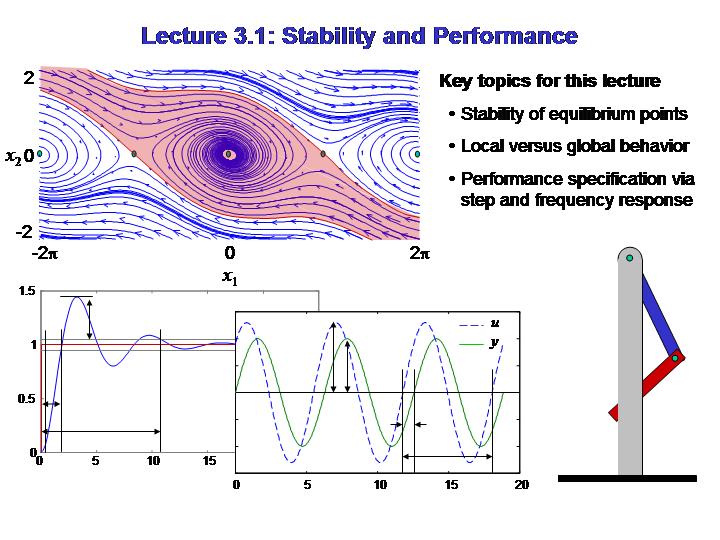 This homework set covers stability and performance through a series of application examples. The first problem provides a set of three real-world models in which the student must identify the equilibrium points and determine stability of the equilibrium points (through simulation). The second problem explores performance specification in the conext of the cruise control example, including step response and frequency response.
