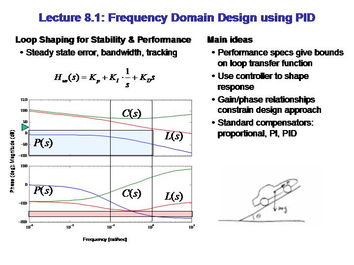 in frequency domain control design using proportional + integral + derivative (PID) control. After reviewing the role of the controller on the loop shape and the relationship between the gain and the phase, we introduce PID control and illustrate its use to design a speed controller that satisfies a given set of performance specifications.